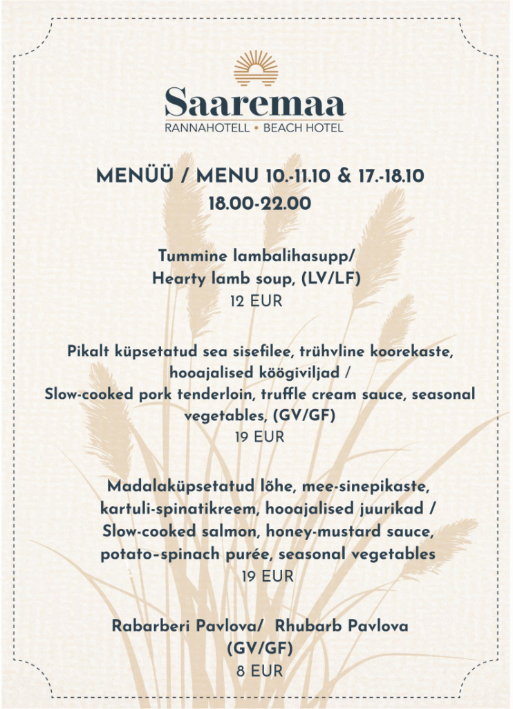 Sügishooajal pakub chef Martti Koppel õhtusööki reedel ja laupäeval 18.00-22.00.
